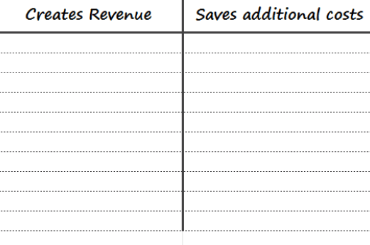 I would also suggest that as Product Managers you arrive at this in your discussion with customers when they suggest/request new enhancements or features. Most of them might not know right off the top how a particular feature would bring new revenue or save cost. They are in most cases living in their own realm. The requirement could come in the form of “I can request and get paid faster” or “I can finish processing these claims faster” or “I could get through more orders in a day”. Hidden in each of them would be the real driver - Additional Revenue or Additional cost savings. Until (at least in your mind) you arrive at that, keep drilling down into the need.
